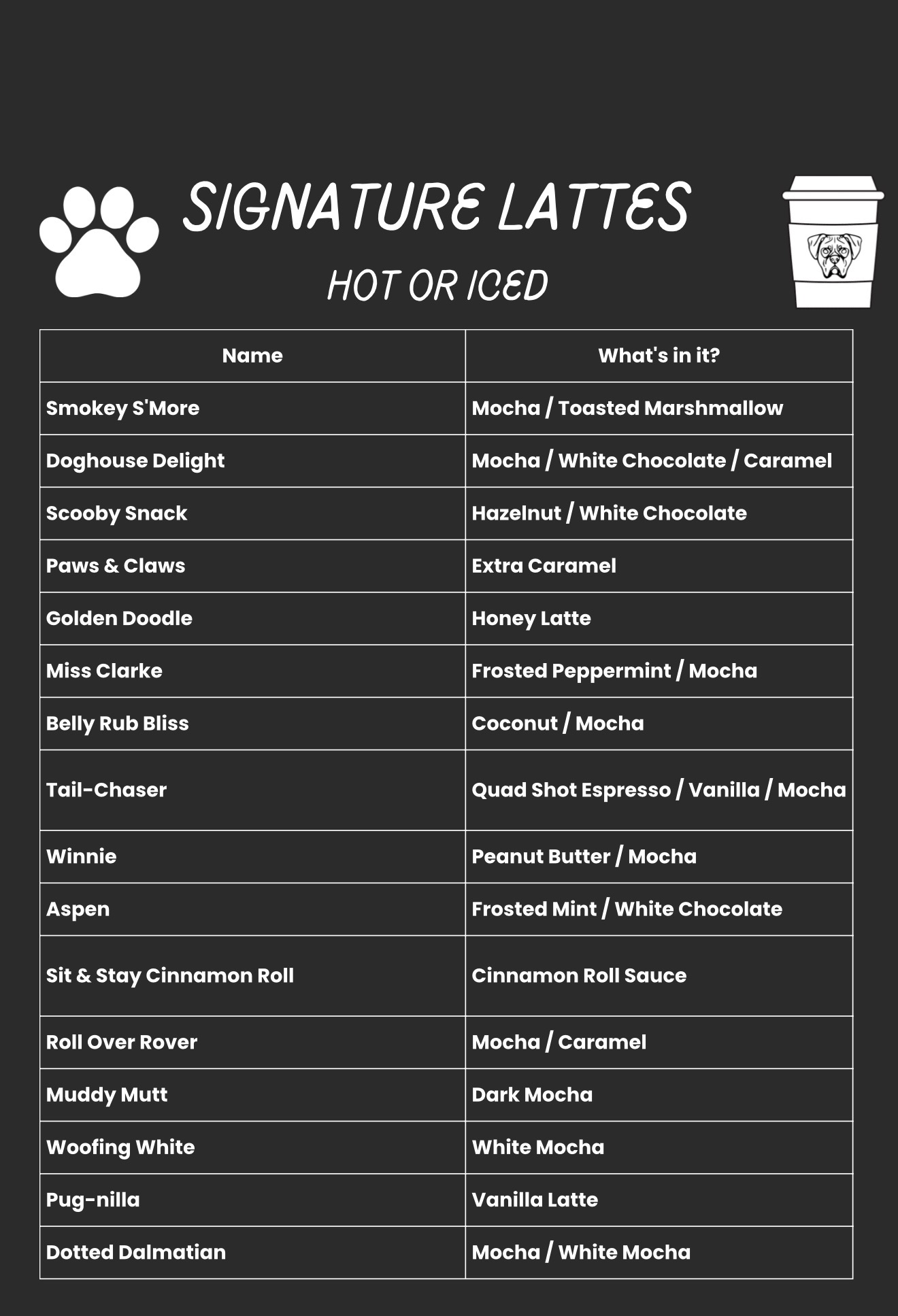 Step up to The Doghouse, where the aroma of our fresh air-roasted coffee wafts through the air and beckons you to indulge. We offer a menu bursting with signature drinks that celebrate our love for dogs. From the “Golden Doodle” to the “Tail Chaser” each drink is crafted to bring a little joy and a lot of flavor to your day.