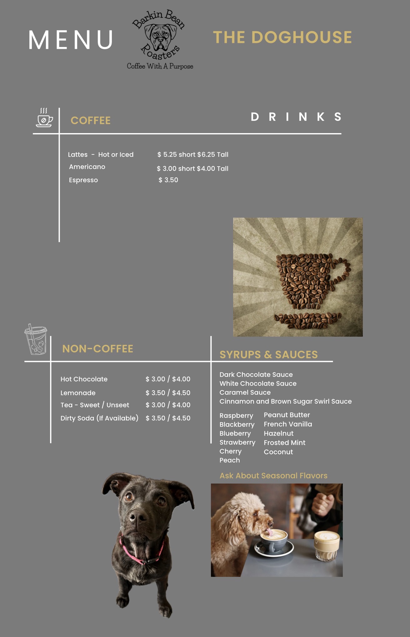 Step up to The Doghouse, where the aroma of our fresh air-roasted coffee wafts through the air and beckons you to indulge. We offer a menu bursting with signature drinks that celebrate our love for dogs. From the “Golden Doodle” to the “Tail Chaser” each drink is crafted to bring a little joy and a lot of flavor to your day.